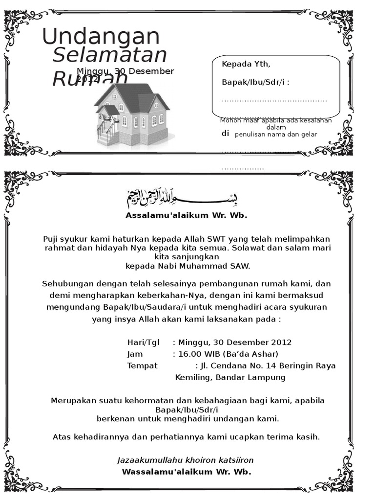 Contoh surat undangan aqiqah format ms word bisa diedit pontren com. Sedang mencari format surat undangan setengah resmi yang baik dan benar? Sebuah perusahaan tentu akan sangat ketat dalam menjalankan administrasi. Berbagai contoh surat resmi perusahaan adalah surat penawaran, surat pesanan, surat pemberitahuan, surat permintaan penawaran, dan berbagai jenis surat resmi lainnya. Jika anda bekerja di bagian administrasi kegiatan surat menyurat adalah hal yang biasa, dan membutuhkan sedikit pengalaman dan kemampuan dalam menulis surat. Dalam contoh surat undangan setengah resmi gawe cv telah memilihkan tema atau template yang terbaik untuk dijadikan inspirasi ide ataupun acuan dalam penulisan surat anda. Contoh surat undangan resmi : Berikut ini adalah berbagai contoh yang dapat menjadi acuan. Contoh surat undangan rapat terbaru untuk rapat desa, perusahaan, rt rw, sekolah, dinas resmi contoh surat undangan rapat perusahaan. Surat undangan adalah surat yang dibuat dengan tujuan mengajak seseorang atau pihak lain untuk menghadiri sebuah acara tertentu. Yang paling mudah dan sering ditemukan adalah contoh surat undangan rapat resmi, baik rapat untuk sekolah, perusahaan, rt, dan sebagainya. Mungkin kebanyakan dari kita telah mengenal dengan jenis surat yang satu ini. Damar/sekip medan petisah medan, 30 oktober 2008 nomor lamp.
